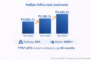 As of December 2025, 1,392 Indian infrastructure projects reported cumulative cost overruns of ₹5.42 lakh crore, above the original estimates of ₹29.68 lakh crore, ballooning to ₹35.10 lakh crore (MoSPI / Devdiscourse, January 2026). Railway projects overran by 54%. Water resources have increased by over 200%. Of 1,873 monitored projects, 779 were delayed an average of 36 months.