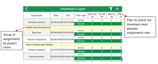 - The improved design for timesheet gives a better experience to users when filling and submitting the timesheet. It has two separate views for timesheet – full timesheet view and planned assignments timesheet view.